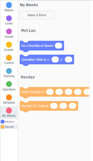 Like lets say a project has a ton of custom blocks, what if you could split them up into categories? Scratch addons I think has the ability to recolor custom blocks but what if you could create local categories for custom blocks where each category has an assigned color? Something like shown in the image. (Doesn't matter if it is only visible to the creator or visible to everyone who has the addon enabled, I think it'd be great for organizing custom blocks either way.)