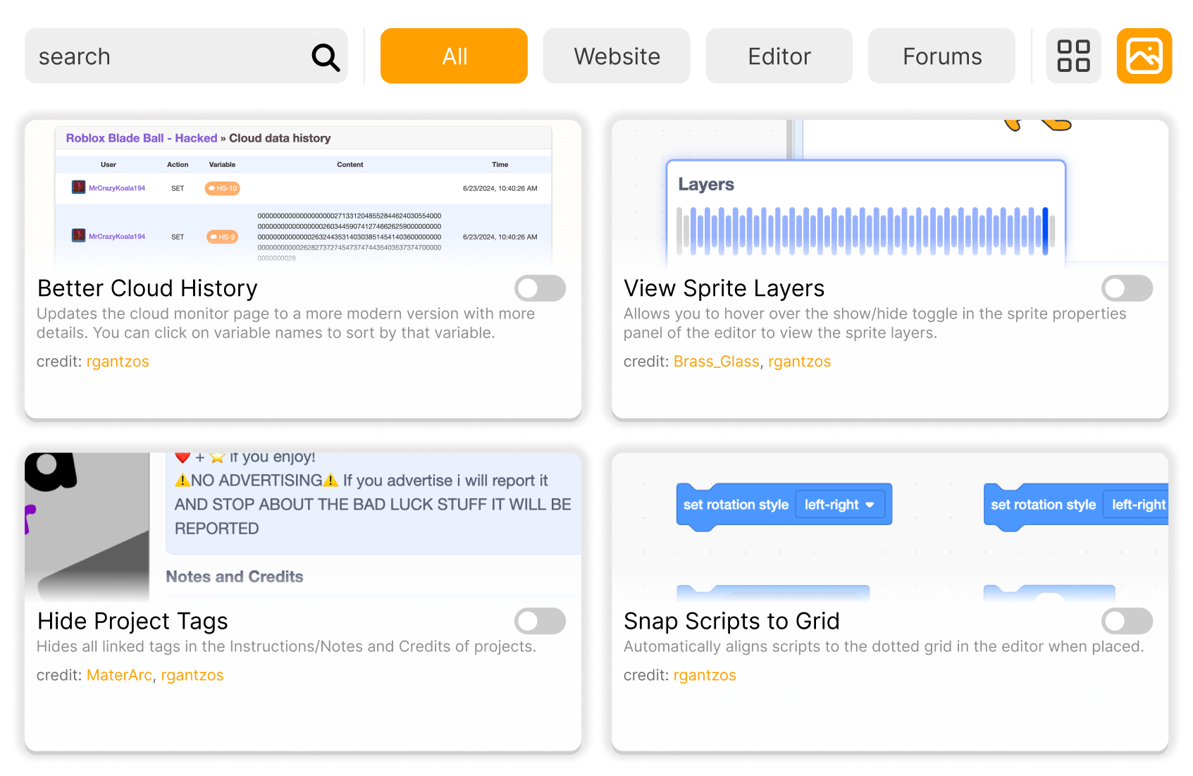 When I first saw the settings page for the extension, it was filled with text, and in order to understand it, I had to read every single word. Since it's displayed in a grid, it would be more intuitive to add a banner at the top of each item to represent the feature, making it easier to find the feature. If this isn't preferred, you could add an option to display or hide the banner. Alternatively, since there is a page at https://www.scratchtools.app/features/, a link to that page could be included instead.